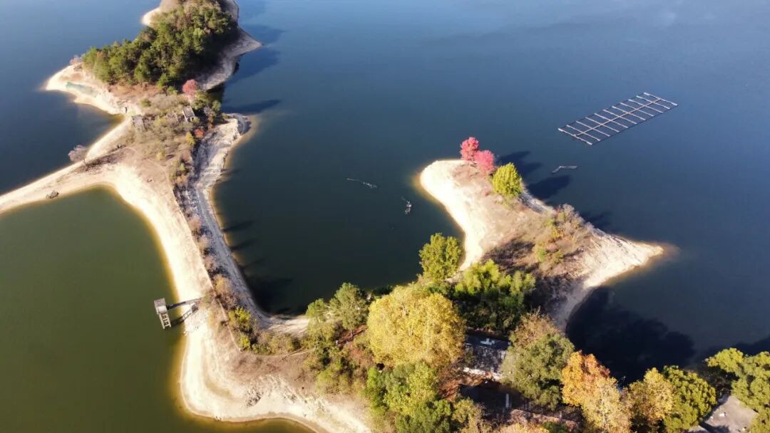 岛上蜿蜒曲折的水库岸线上、山岭上,遍布着野生的乌桕树和枫树。