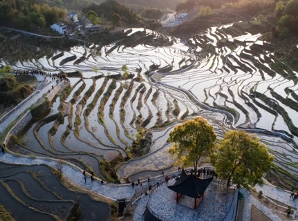 雾云山梯田,位于湖北省蕲春县檀林镇雾云山村雷公岩,是唐朝年间保存下来的梯田,梯田群的地形、地貌和天地合一优美绝伦的线条,惊艳着一批批过往的行人。