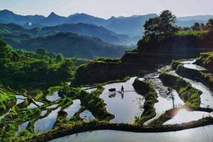 雾云山梯田主要分布在海拔600米以上的山区坡地,其中雷公岩梯田面积最大,总面积为110亩,分为310块小田,最高处与最低处落差为120米,从空中俯瞰,既美丽,又壮观,可与云南元阳梯田比美。