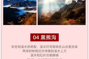 待雾散去,我们顺着观光道穿越黄金大道,来到【黑熊沟】。尽管这里长度仅2公里,却聚集了光雾山的精华景色。跌水瀑布飞起白色浪花跌落在深绿色的潭水中,潭水中怪石嶙峋,流水从石中左冲右突,两岸是青冈树,树上的红叶层次分明,暗红色,橙红色、黄色、青黄色......描绘出一幅缤纷绚丽的奇景。木栈道沿沟蜿蜒修建,大家可以在这里尽情拍摄和创作!