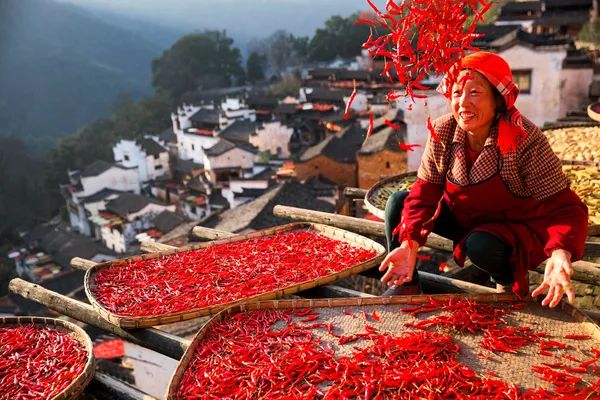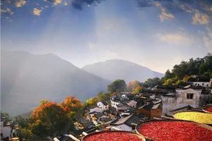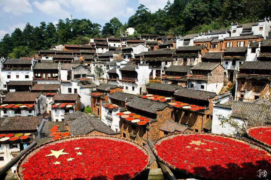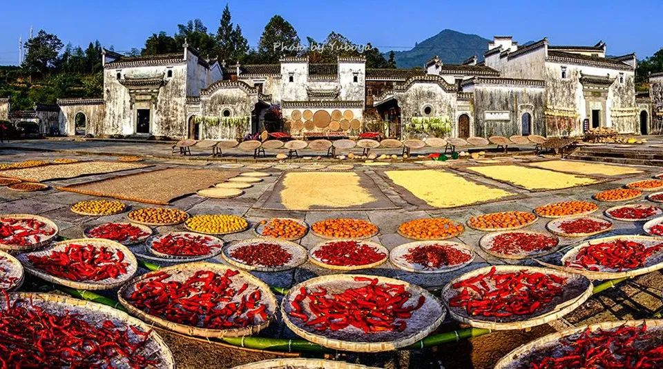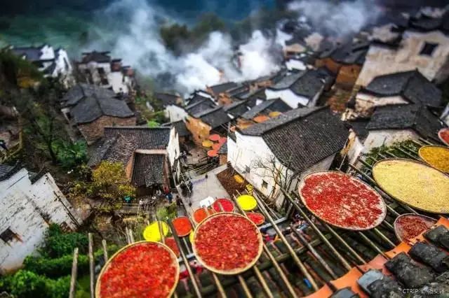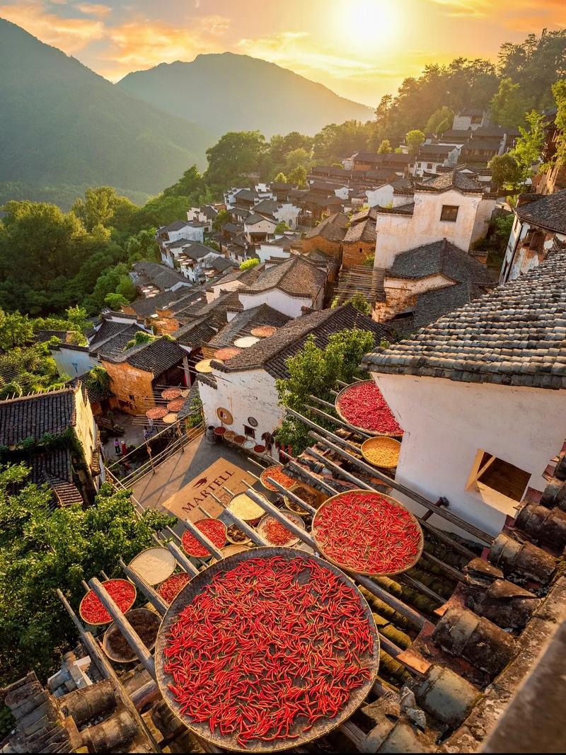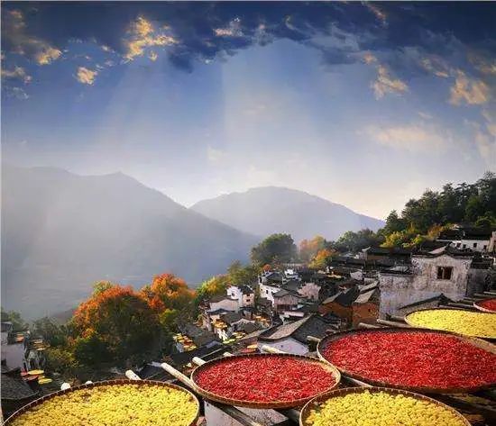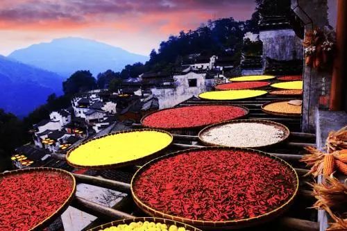 篁岭古村数百栋徽派古民居在百米落差的坡面错落有序排布,每当日出山头,晨曦映照,整个山间村落饱经沧桑的徽式民居土砖外墙与晒架上、圆圆晒匾里五彩缤纷丰收果实组合,绘就出世界独一无二的“晒秋”农俗景观、最美的乡村符号。