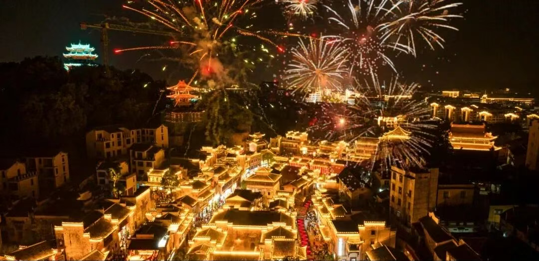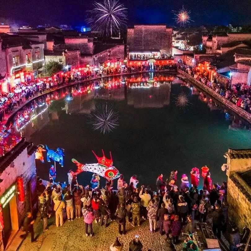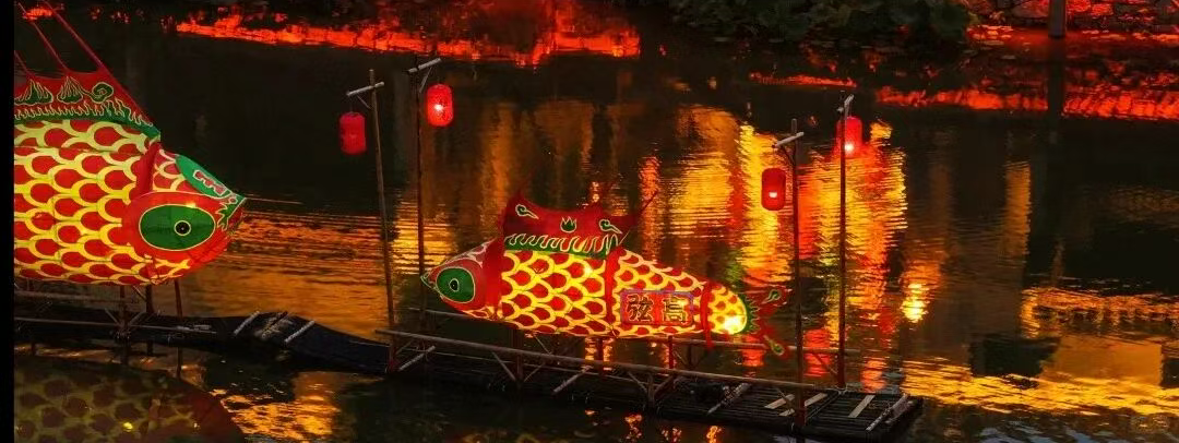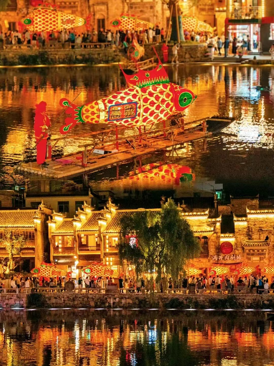 夜晚竹筏鱼灯点亮湖畔,灯光倒映在水面上,仿佛星河坠落人间,上演一场浪漫的演出,还有街巷的鱼灯巡游表演,热热闹闹,映衬漫天烟花很有氛围。