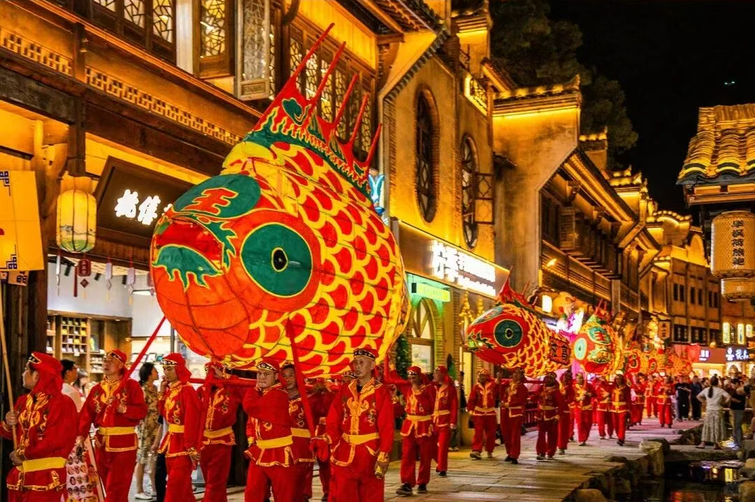 5米巨鱼灯领队,百盏鱼灯随鼓点摇曳,光影在古巷间流动如星河。