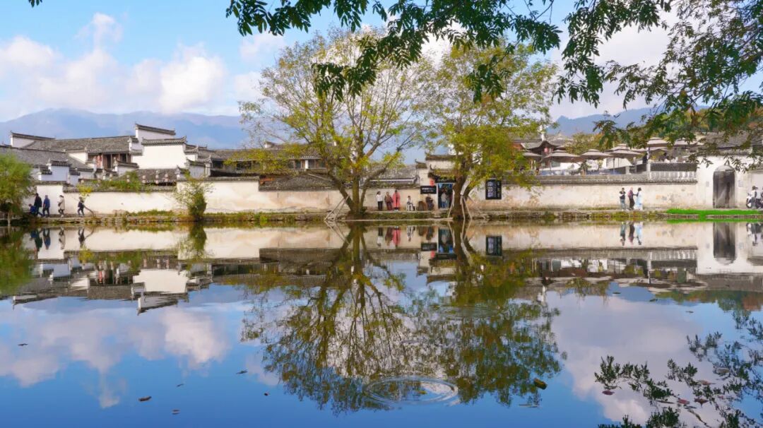 村里有巨大的月沼和南湖,徽派民居倒映在水中。