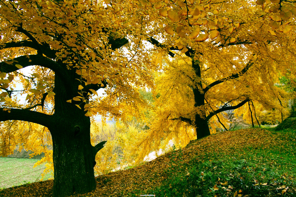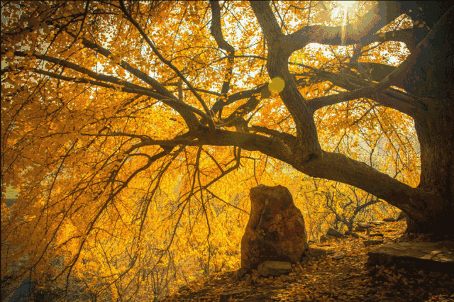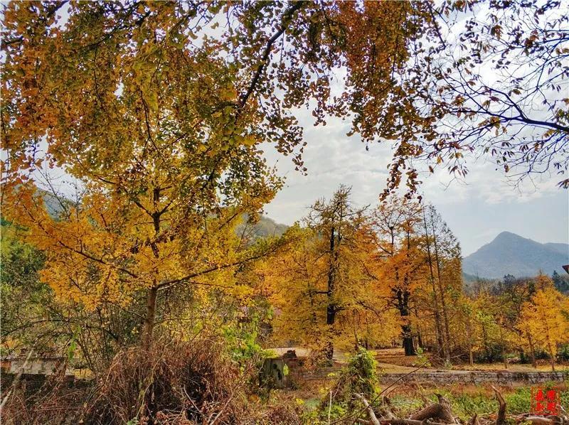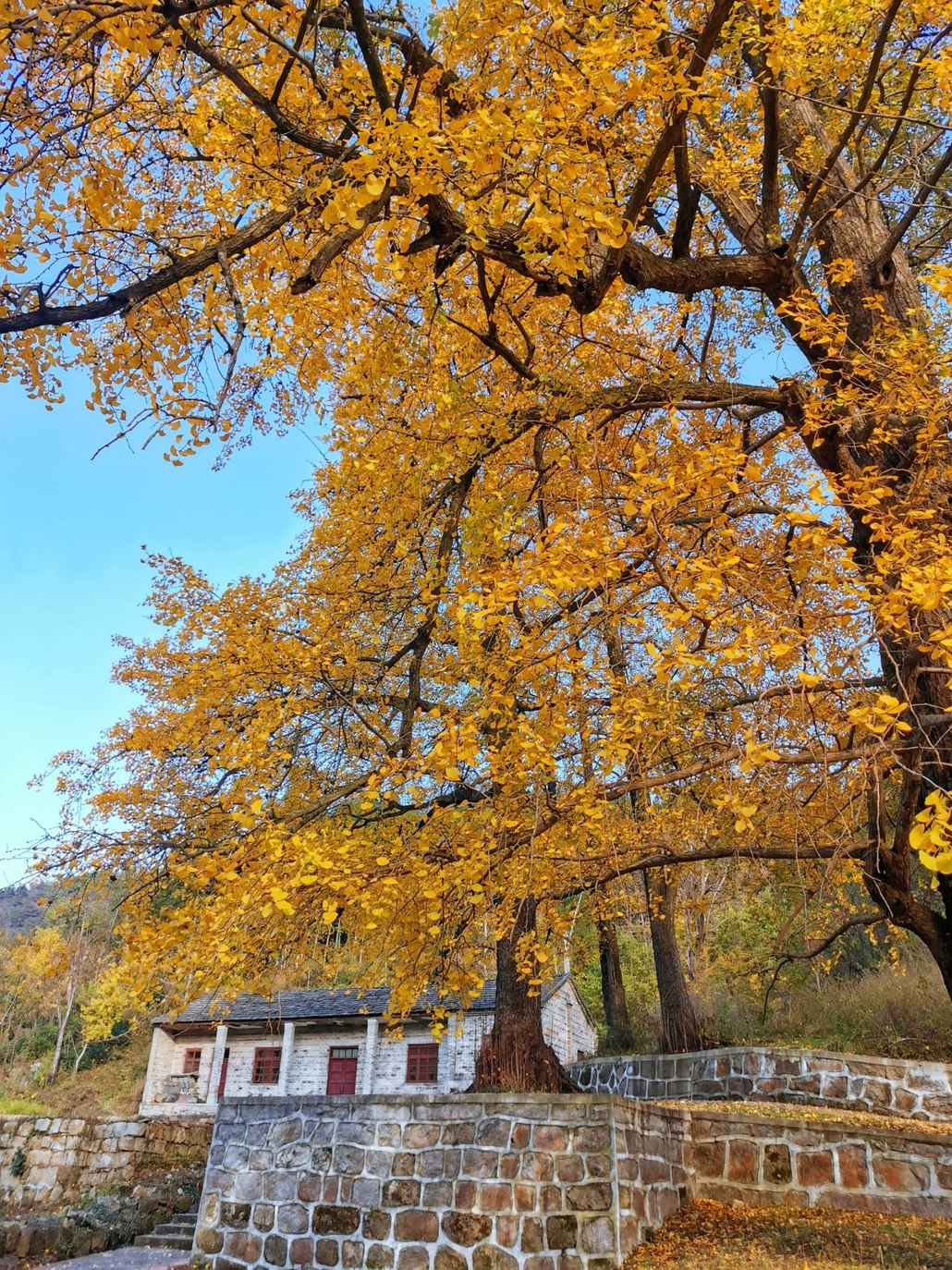 行走在银杏下,蓝的是天空,青的是松柏,黄的是银杏,阵阵的秋风与飘飞的落叶,潺潺流水与嘤嘤鸟鸣,如油画一般的田园风光,美的令人沉醉。