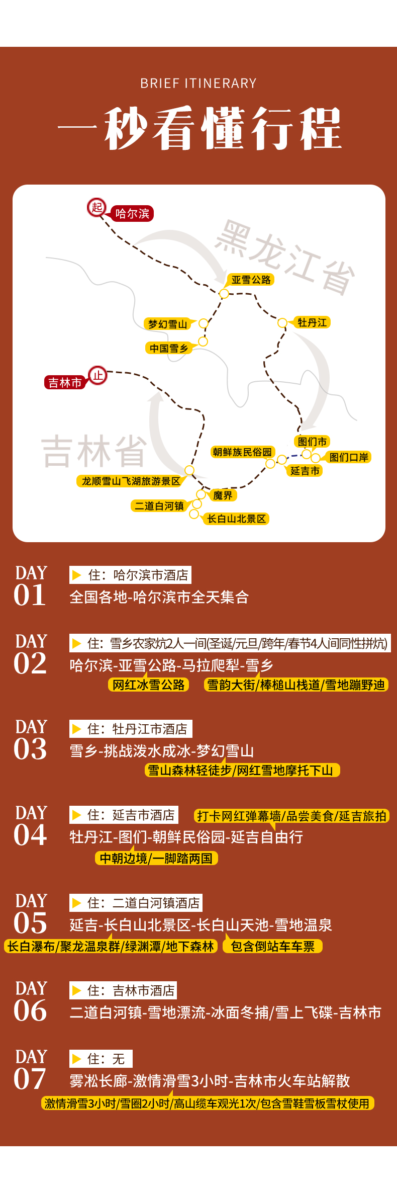 亚雪公路+童话雪乡+延吉+图们口岸+徒步梦幻雪山+网红雪地摩托刷山+马拉爬犁+长白山北坡(包含天池倒站车)+雪地温泉+雪地漂流+冬捕+雪圈漂移+吉林万科滑雪+花棉袄cosplay+雾凇奇观