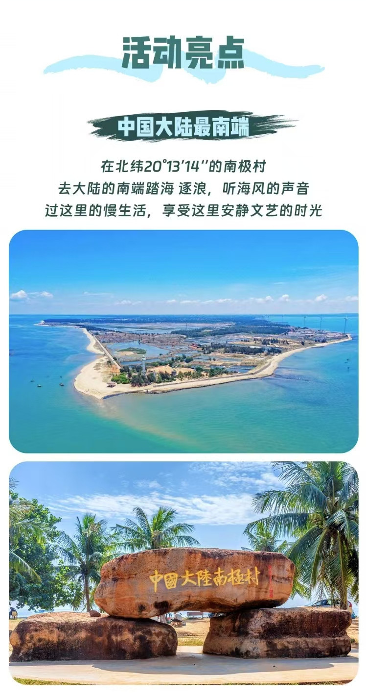 适时前往中国大陆【南极村】,这里拥有南端的灯楼角,南海与北部湾的接吻浪,中国大陆面积较大的珊瑚礁群。在这里,你可以打卡拍摄以灯角楼、合水线、盐田、珊瑚礁石、风车、阳光沙滩等众多元素组合而成的大陆南端。