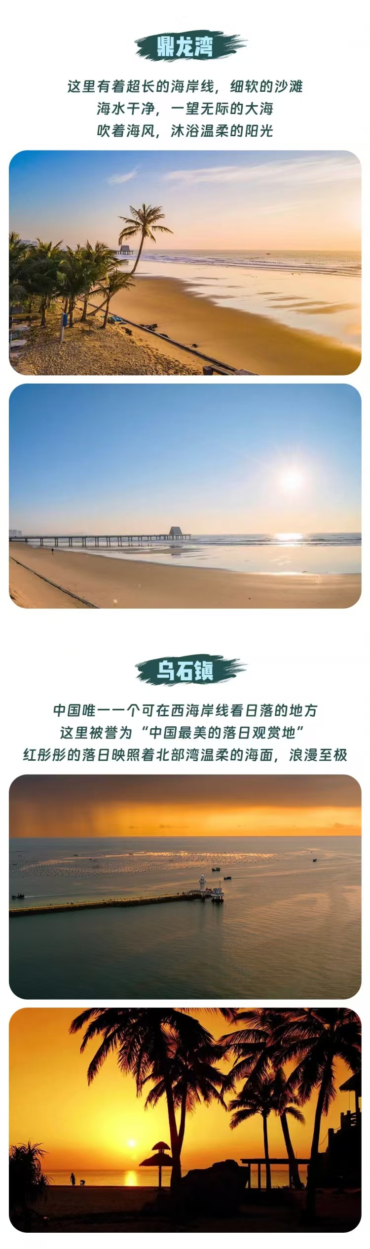 下午前往【乌石镇】酒店,先办理入住,后前往沙滩,看夕阳落海。这里拥有“中国唯一一个在西海岸看日落的地方”的称号,但少有外地游客知晓。