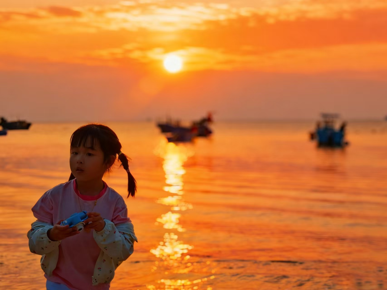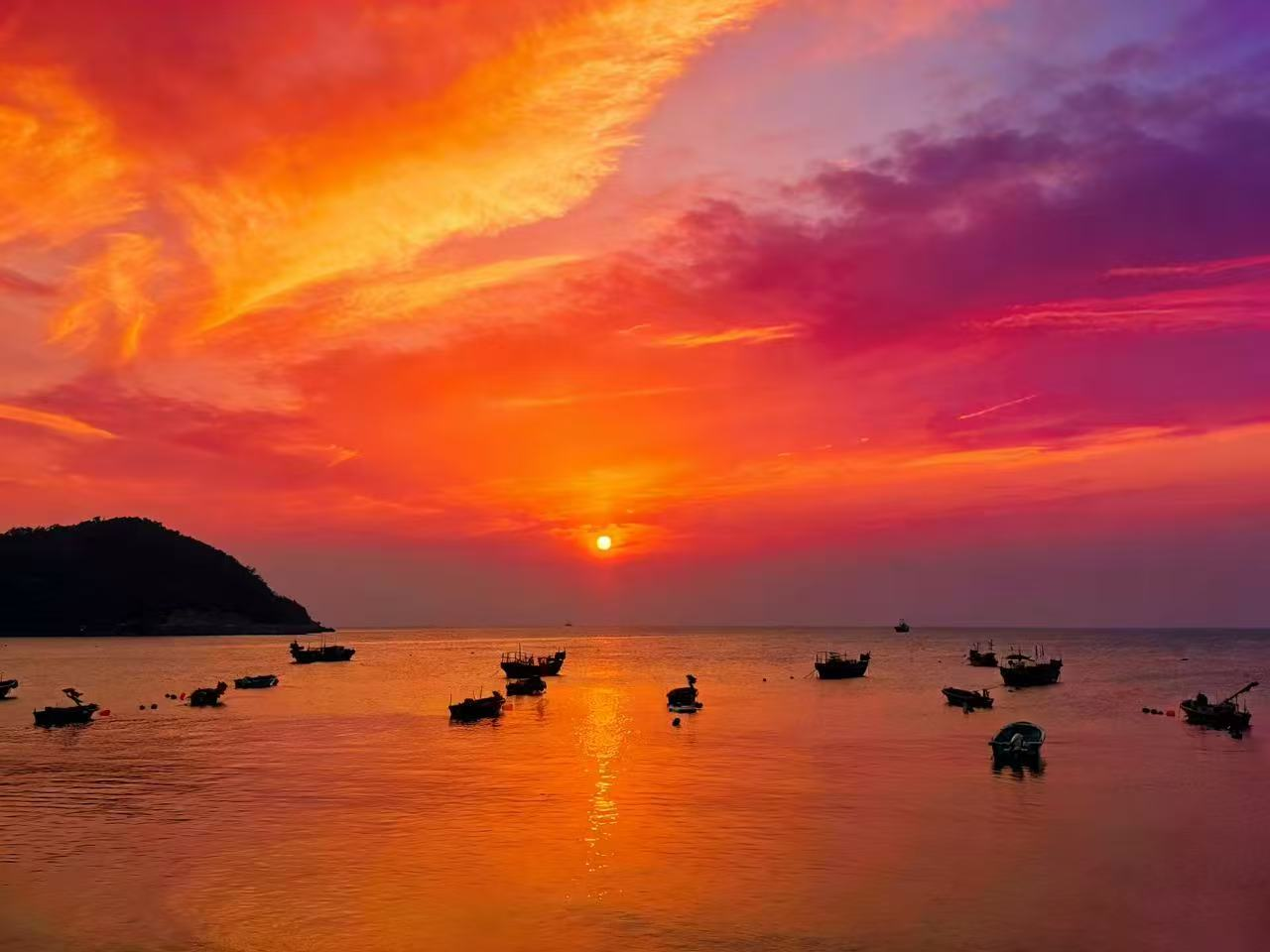 这里没有连锁海鲜酒楼,全是本地渔民开的家常排档,海鲜当天现捞上岸,新鲜又实惠,坐在海边就能直接开吃。同时这里也是下川岛公认的最佳日落观赏点,夕阳把海面染成橘金色,渔船归港的剪影配上晚风,氛围感拉满。
