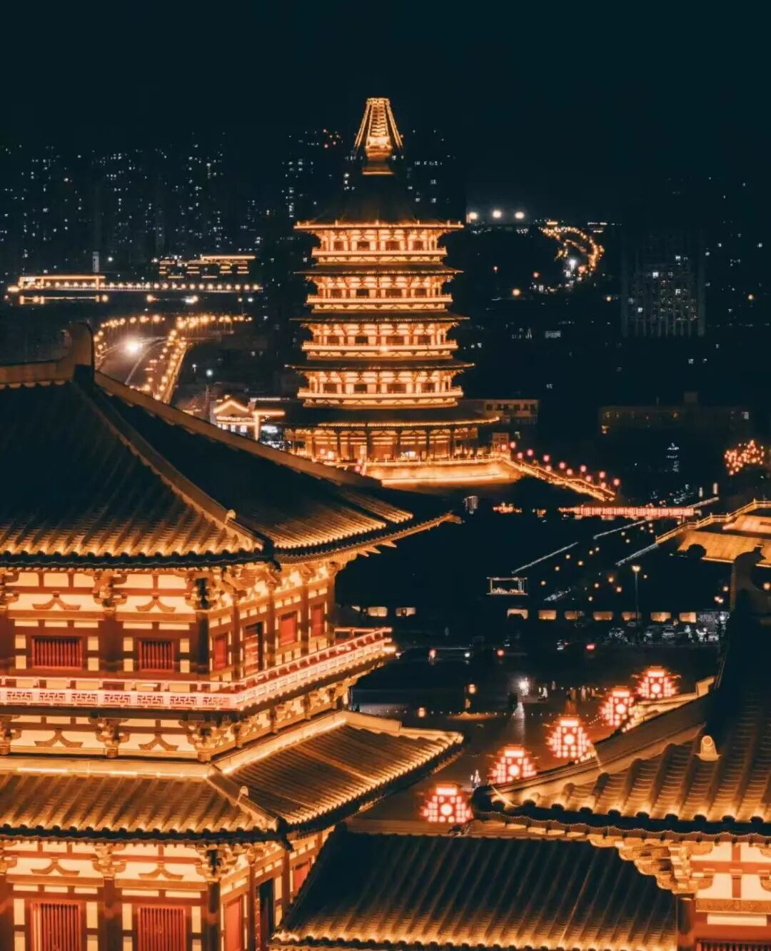 华灯初上,灯火辉煌,亭台楼阁在灯光的映衬下美不胜收