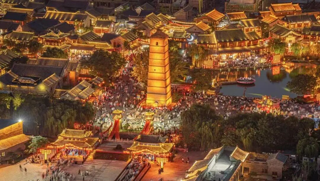 灯火辉煌的仿古建筑,飞檐翘角在夜色中勾勒出优美线条,灯光如星,点亮每一处雕梁画栋,这里,就是洛邑古城。