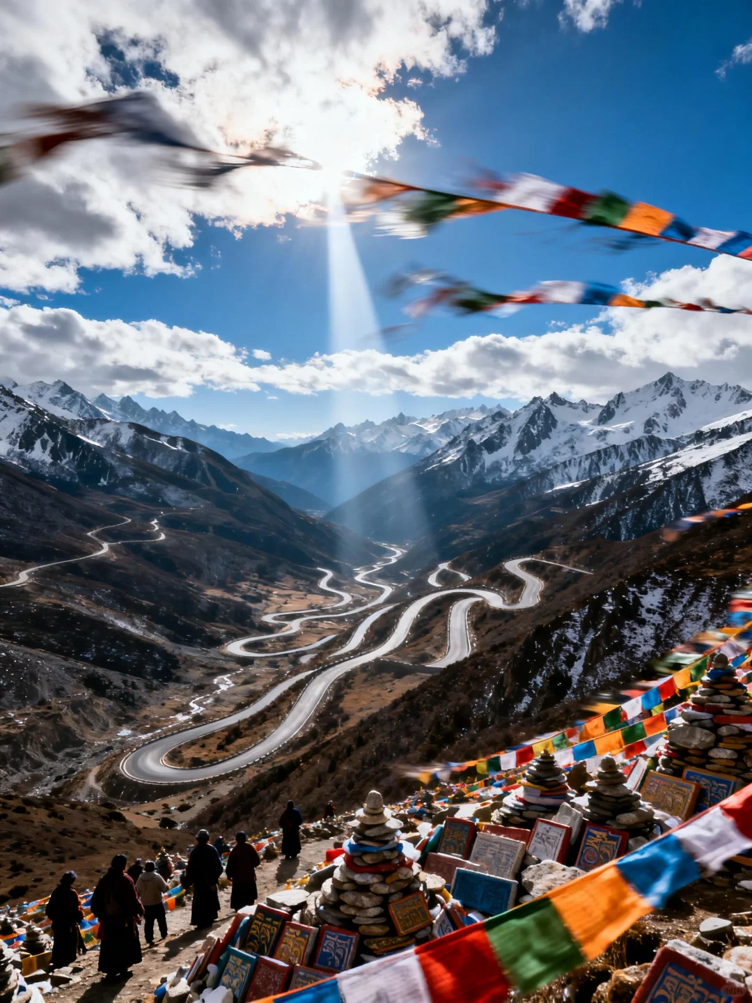 出发后,翻越业拉山(海拔4658米),就可以看到闻名于川藏线上的“怒江72拐”,从最高点一路盘旋下降至最低点海拔3100米,长约12公里,过怒江桥时大家切记不要拍照哦!最后下到八宿县城。