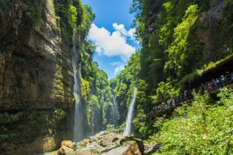 早上动车出发前往恩施,中午恩施火车站站前广场集合,午餐后包车前往鹿院坪(约2.5小时),沿途停靠观景台,到达景区办理门票后,行走悬崖栈道,俯瞰鹿苑坪,徒步1819级台阶下到鹿院坪,前往客栈分房,稍作休息后领队带领大家前往四级瀑布、地缝、鹿饮潭等鹿院坪的经典景点。