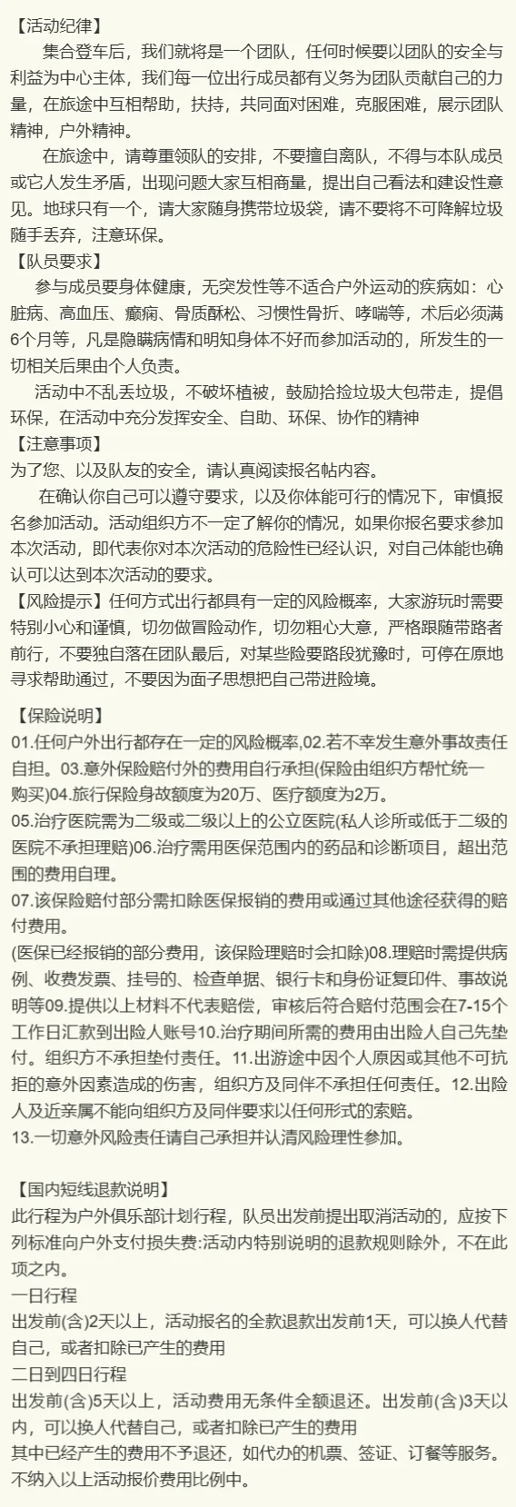 4、参加活动者务必遵循自助的原则,所有装备和物资一律自己背负,除非出现紧急情况;虽然在活动中领队和其他队员会尽力帮助需要帮助的队员,但每位队员必须明白:在户外领队和其他队员能够给予的帮助是十分有限的,因此队员要立足于依靠自己的能力完成活动,对自己的行为负责。