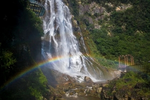 11:30到达岳西,中餐后游览彩虹瀑布,景区内群峰迭起,山峦从翠,主景点“华东第一瀑布”高98米,宽35米,水流自猴子崖飞泄而下,气势磅礴,吼声如雷。站在不同方位观景台上看到清澈的河水撞击坚石,水花四溅,犹如喷雾行云,阳光透过水雾,呈现一道绚丽的彩虹。让你体会“不经历风雨也能见彩虹”的自然奇观,同时你行走时,人行虹移,有一种梦幻的感觉。过瀑布走进太极峡谷、峡谷幽深、怪石嶙峋、似巨鳄、像蛟龙、如卧虎、水质清澈、潭潭相连,可比九寨沟。经卧虎潭、神龙潭可向左过河,顺水而下,过彩虹隧道,来到瀑布侧面观瀑,又是一番景象。