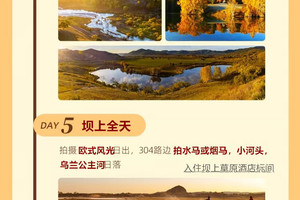 注:领队会根据实际情况,调整坝上行程景点拍摄顺序!尽力争取让大家在最合适的时间看到最美的景色,坝上草原如果天气好这一天换成景区越野车……