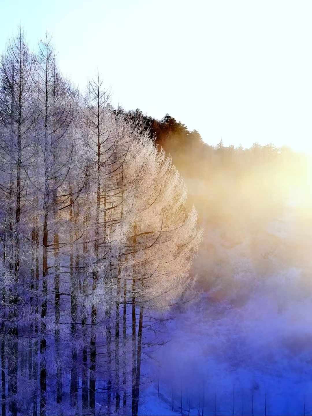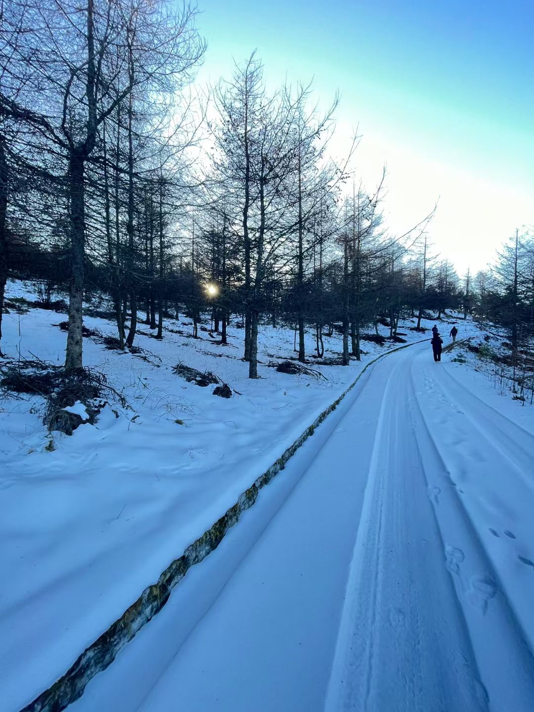 天池的冬天美得无与伦比。森林中的山径如素笺,蜿蜓向深处铺去。冰雪悬挂在树上,将落未落,好像稍大点的声音都把它们震落下来。