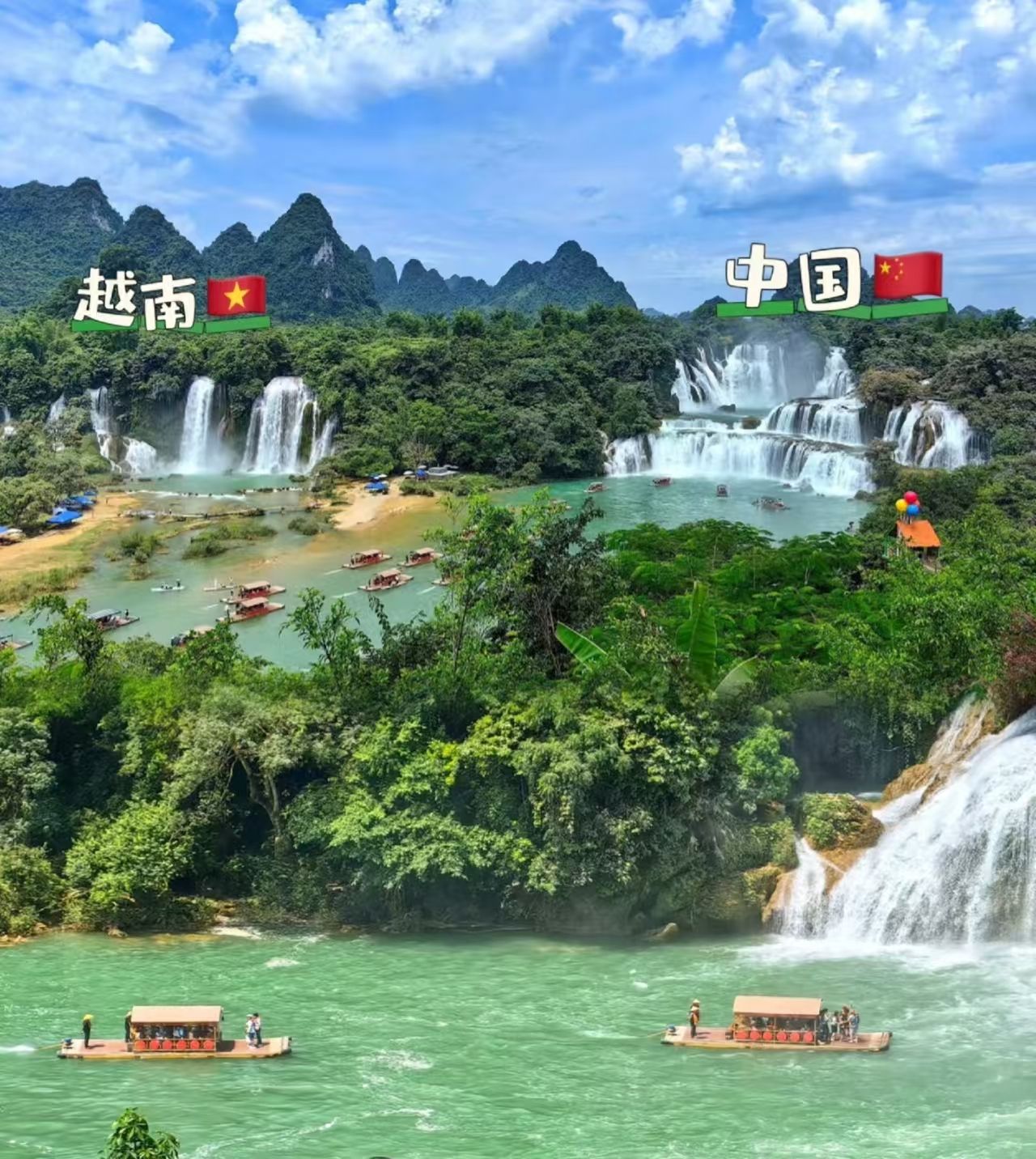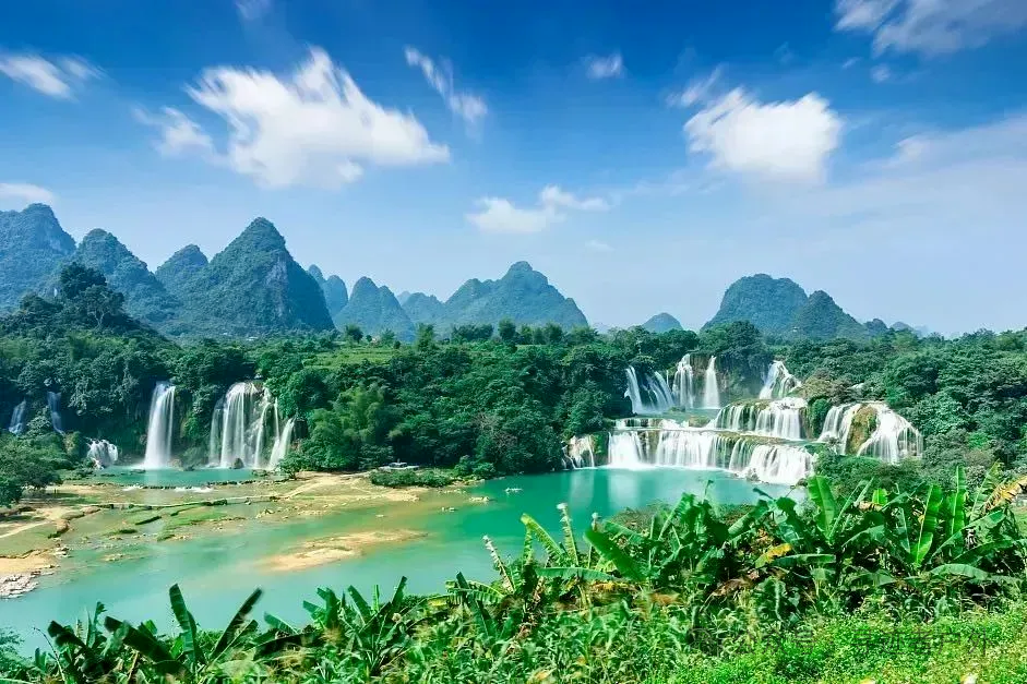 早餐后前往德天跨国瀑布,前往世界著名的亚洲第一跨国瀑布【德天瀑布】游玩,这座与越南板约瀑布相连的跨国瀑布气势磅礴,一波三折,层层跌落,曲折于参天古木间,更有花草掩映,百鸟低徊。江水忽遇断崖,飞泻直下,仰望瀑顶,群峰浮动,巨瀑如海倾,水沫飞溅,如万斛明珠。德天瀑布雄奇瑰丽,变幻多姿,碧水长流,永不干涸,中越边境清代53号界碑合影。晚上住百色