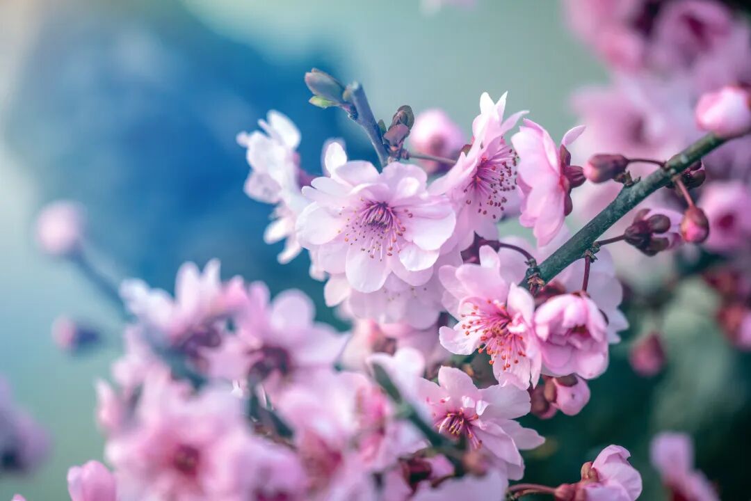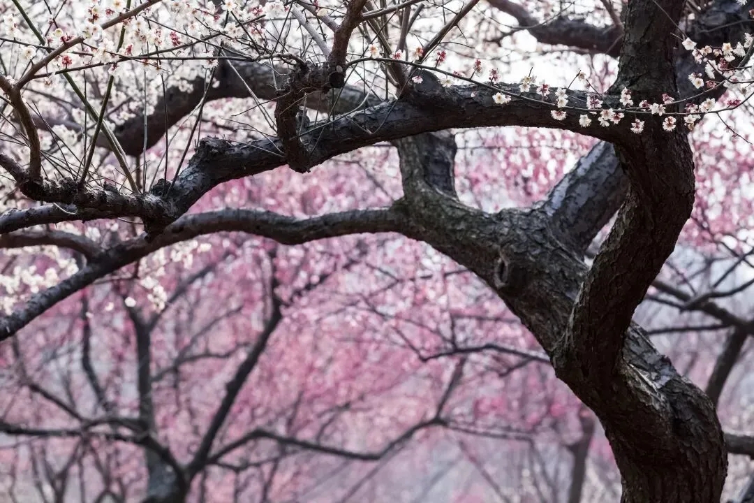 美人梅树错落有致地分布枝干蜿蜒,仿佛天然的画框每一朵都精心雕琢般精致花瓣轻薄如纱微风吹过,纷纷扬扬