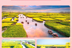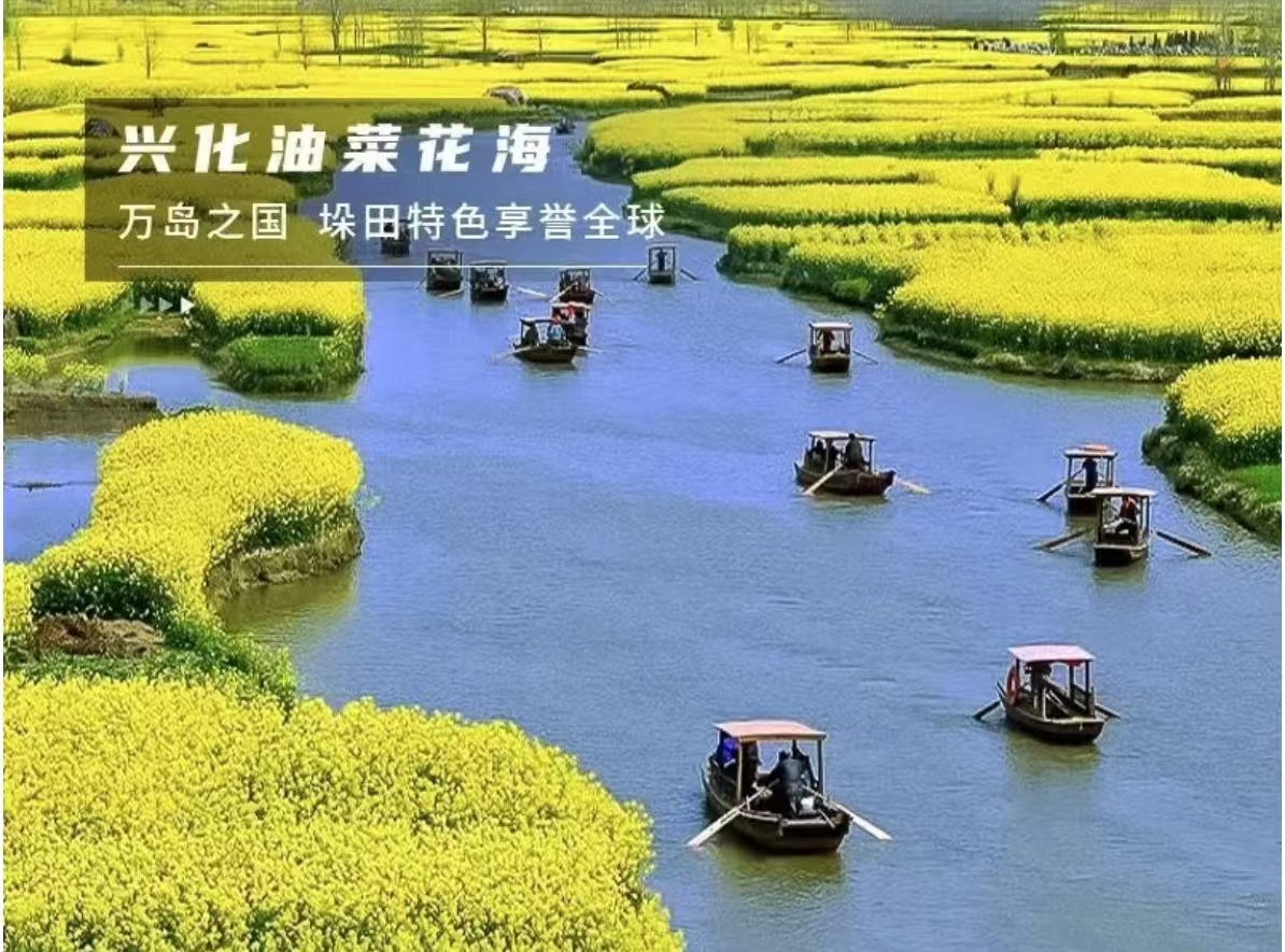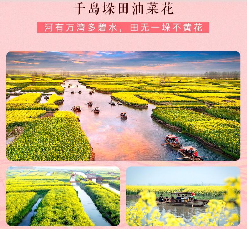 今天我们需要早起,我们前往“中国四大油菜花海之一”──【兴化千岛油菜花风景区】。千岛菜花景区座落在河网纵横的缸顾乡,一条条的小河又分支出一条条的小沟,南北东西延伸开去,把一整块的田分列割成了千百个“小岛”,这种“小岛”兴化人把它称作“垛”。垛子只比水面高出一点点,整齐划一地排着,就像是列队检阅的方阵,气势恢宏,波澜壮阔,登上20多米高的观光瞭望台,极目远眺,满眼尽是金黄色的菜花,形成一道独特的自然风景,身临其境,心旷神怡……也可以乘坐小船在小岛间穿梭,在这堪比威尼斯更错综复杂的水道中缓缓前行,每一处转角都是迎面而来的生机盎然。爱拍照的游侠,一定要穿着鲜艳哈,徜徉在花的海洋里尽情享受。