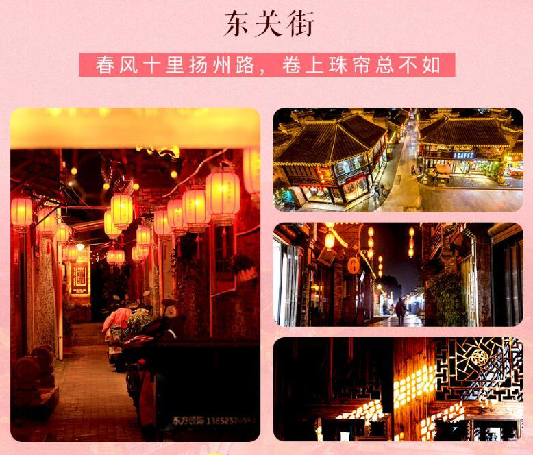 随后车赴扬州东关街,参观中国历史文化名街,扬州城里最具有代表性的一条明清风格的历史老街。东关街以前不仅是扬州水陆交通要冲,而且是商业、手工业和宗教文化中心。街面上市井繁华、商家林立,行当俱全,生意兴隆。陆陈行、油米坊、鲜鱼行、八鲜行、瓜果行、竹木行近百家之多。